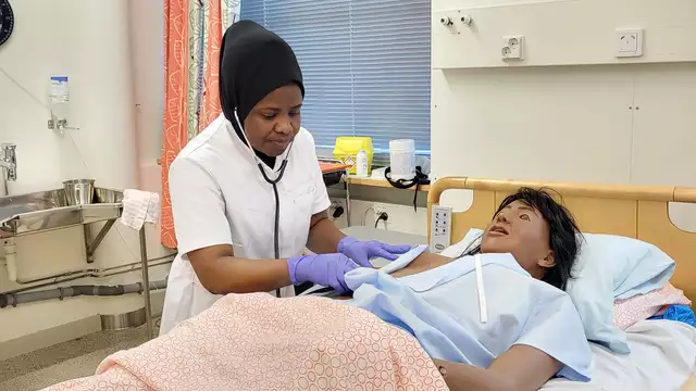 Nursing student Mushiatu practicing on patient doll at Arcada’s patient safety and learning centre.