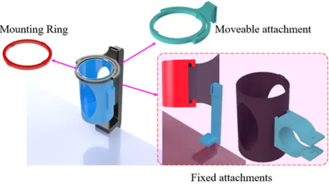 The design process follows the conventional product development steps (Ashby, 2017; Mattson & Sorensen, 2020) and aims to lower the centre of mass of the system. The gyroscopic system consists of a mounting ring, a moveable, and a fixed attachment. Altogether, the assembled sub-components provide the cup freedom of rotations in X-Z and Y-Z planes, thus make sure the content in cup is not spilled. The 3D CAD rendering that shows the components and their assembly is presented in Fig.1.