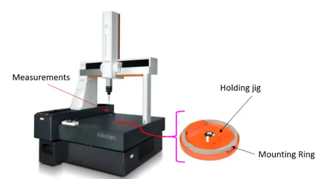 To conduct the measurements, we used the Crysta-Apex from Mitutoyo, a high accuracy coordinate measuring machine (CMM). We used custom made jig to fix the mounting ring on the CMM, see Fig.5. A 4 mm diameter probe is used for the measurements.