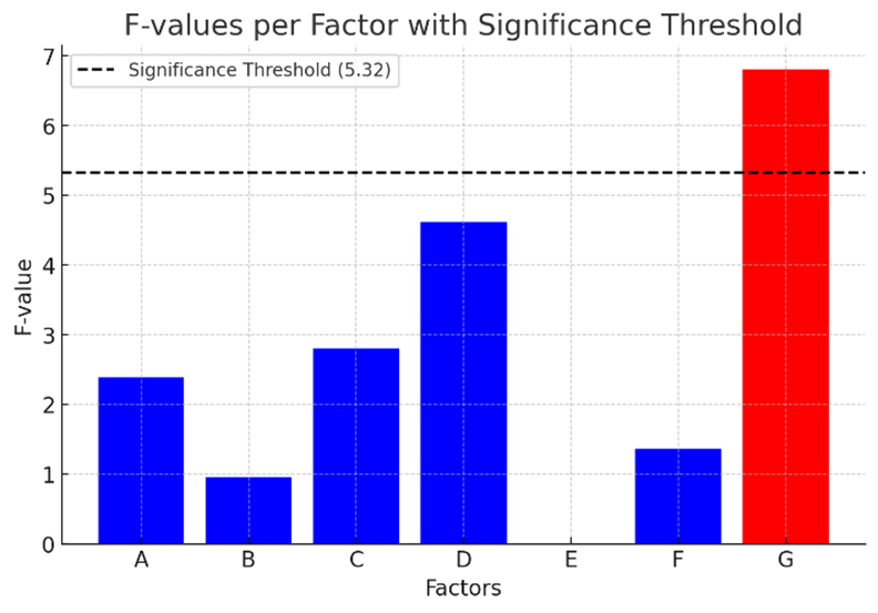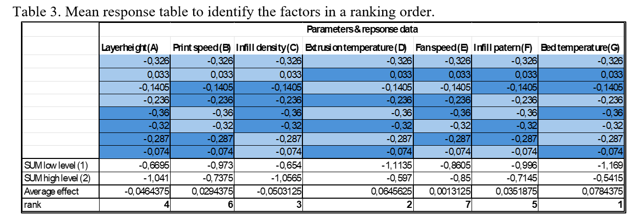 The ANOVA also showed the ranking order of the factors’ influences on the quality characteristic, however only identified the bed temperature as a statistically significant factor with F-value = 6.81for a critical F-value of F (5%,1,8) = 5.32. The ANOVA is used to identify the F-values of each factor, see Fig. 6.