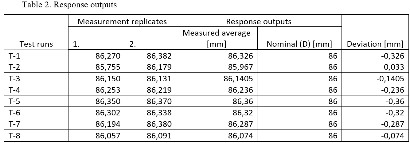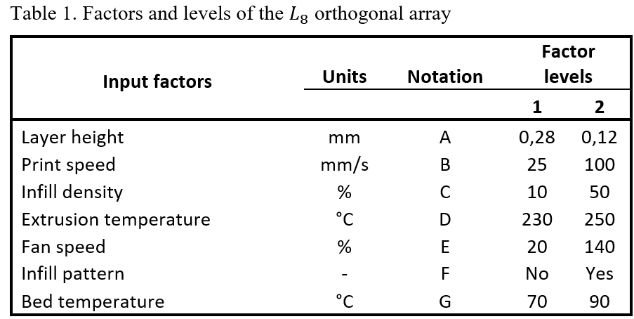 The internal diameter D with a nominal value of 86 mm is the critical dimension of the component. Manufacturing the component with accurate diameter is a requirement, however in 3D printing, the process parameters strongly influence the dimensional accuracy of additive-manufactured parts. To understand the influence of the process parameters, and to determine the optimum settings that lead to a dimensionally accurate mounting ring, we used the Taguchi DoE (Yang & El-Haik, 2003). The Taguchi method systematically tests several variables at once using fractional factorial DoE (Ross, 1996). The fractional factorial experiment is based on first, selecting appropriate orthogonal array for the analysis, and second, conducting statistical analyses using mean of responses and analysis of variance (ANOVA) methods (Yang & El-Haik, 2003). We studied the influences of seven 3D printing parameters (factors) at two different levels using the L8 orthogonal array. The details of the factors and levels are presented in Table 1.