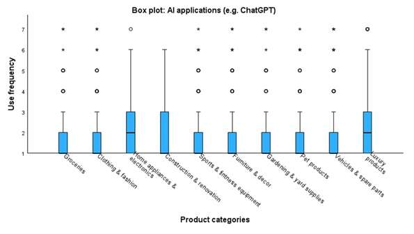 AI applications along with online chat services rank low across all product categories included, suggesting low usage overall for these types of applications. Search engines ranked the highest (see Figure 1). However, based on a box plot analysis (see Figure 2) for three product categories (luxury products, home appliances & electronics, and construction & renovation), the whiskers reach 6, indicating that a fairly large number of consumers regularly use AI applications, especially for these product categories. Extremes (dots and asterisks in Figure 2) are also noted for almost all categories.