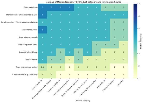 Figure 1. Heat map of median frequency by product category and information source (generated with the help of MS Copilot).