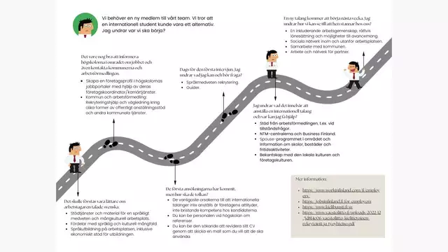 Eftersom internationella studenter i Finland i hög grad är beroende av den lokala sysselsättningen är det viktigt att möjliggöra rekrytering och bibehållande av internationella studenter på finländska arbetsplatser. Vi arbetade med denna utmaning i en undergrupp som fokuserade specifikt på företagskultur i finska företag. Vi valde att fokusera på finska små- och medelstora företag eftersom dessa år 2021 utgjorde 99,9 % av alla företag inom den privata sektorn (Tilastokeskus, n.d.). 96,6 % av de små och medelstora företagen i Finland var dock i själva verket mikro- och småföretag med endast 0-9 anställda (Tilastokeskus, n.d.). Många av dessa företag har svårt att attrahera och behålla internationella talanger eftersom de inte har tid eller resurser att anpassa sina processer och sin kultur till den nya arbetsmarknaden som är allt mer konkurrensutsatt på grund av arbetskraftsbrist. De kan därför behöva mer stöd från externa aktörer om de saknar personalresurser eller rekryteringskompetens. Men även om förmågan att göra något kan läras, måste viljan komma inifrån. Vi valde därför att fokusera vår uppmärksamhet på företag som kanske är villiga, men inte har förmågan, att anställa internationella studenter, och utforska potentiella lösningar för att öka deras förmåga genom stöd från externa aktörer. Vi bestämde oss för att skapa en drömstig till rekrytering av internationella talanger för företag med en "jag skulle anställa om jag visste hur man gör"-attityd.