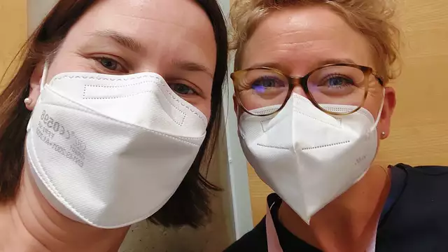 Christine Stockmann-Broo och Anu Nyberg under ett skift på en vaccinationspunkt i Helsingfors.