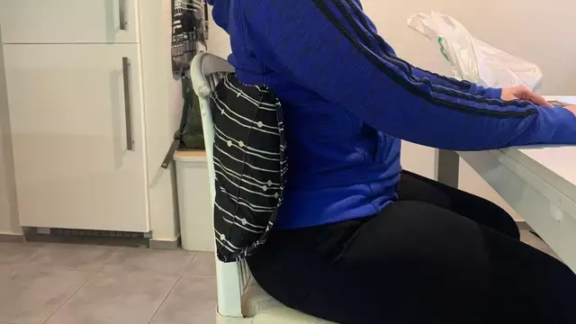 Exempel på en strategi eller ett hjälpmedel för kronisk smärta i vardagen. Personen i bilden lider av kronisk ländryggsvärk som förvärras av långvarigt sittande. Då har personen själv sytt ihop en dyna som fungerar som ett ryggstöd. Dynan är designad för att stöda just denna person och hens personliga behov.