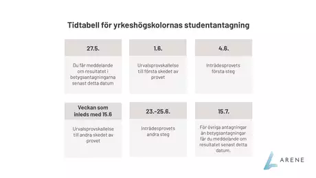 Yrkeshögskolornas inträdesprov arrangeras i juni i två steg. Provdagen för det första delprovet är den 4.6. Då hålls ett digitalt prov på distans. Tidpunkten för det andra delprovet och hur det provet kommer att genomföras meddelas i maj.