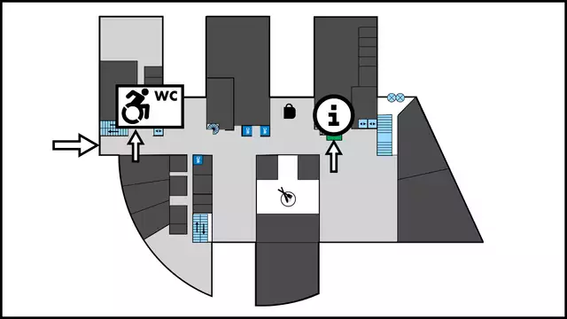 - Det finns flera toaletter på varje våning. Varje våning har också en tillgänglig toalett som är tillgänglig med rullstol. Se kartan nedan var närmaste tillgänglig toalett finns från Tavastvägens ingång samt var informationsdisken finns.