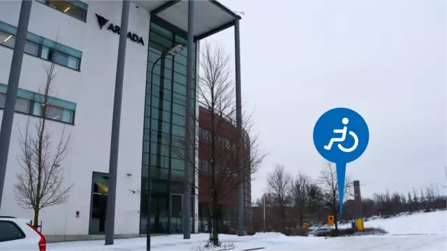 - Utanför Tavastvägens ingång (Tavastvägen 107) finns en tillgänglig parkering. Den finns i anslutning till rondellplatsen vid vägbomens placering. Ingången från Tavastvägen har en ramp till första våningen i Arcadabyggnaden.